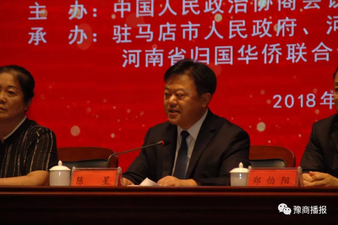 陈星在讲话中首先代表驻马店市委、市人大、市政府、市政协和全市人民,向第十三届豫商大会的成功举办表示热烈祝贺!向所有关心、支持、参与本届大会的各位领导、各位嘉宾、广大豫商、海内外客商和新闻界的朋友们表示衷心感谢!他说,本届豫商大会在省委、省政府、省政协的正确领导下,在省商务厅、省工商联、省侨联、省豫商联合会的大力支持下,在各方积极参与和共同努力下,办出了特色、办出了成效、办出了影响,取得了圆满成功,为进一步弘扬豫商精神、传承豫商文化、展示豫商形象、凝聚豫商力量作出了新的贡献,架起了合作共赢的新桥梁。