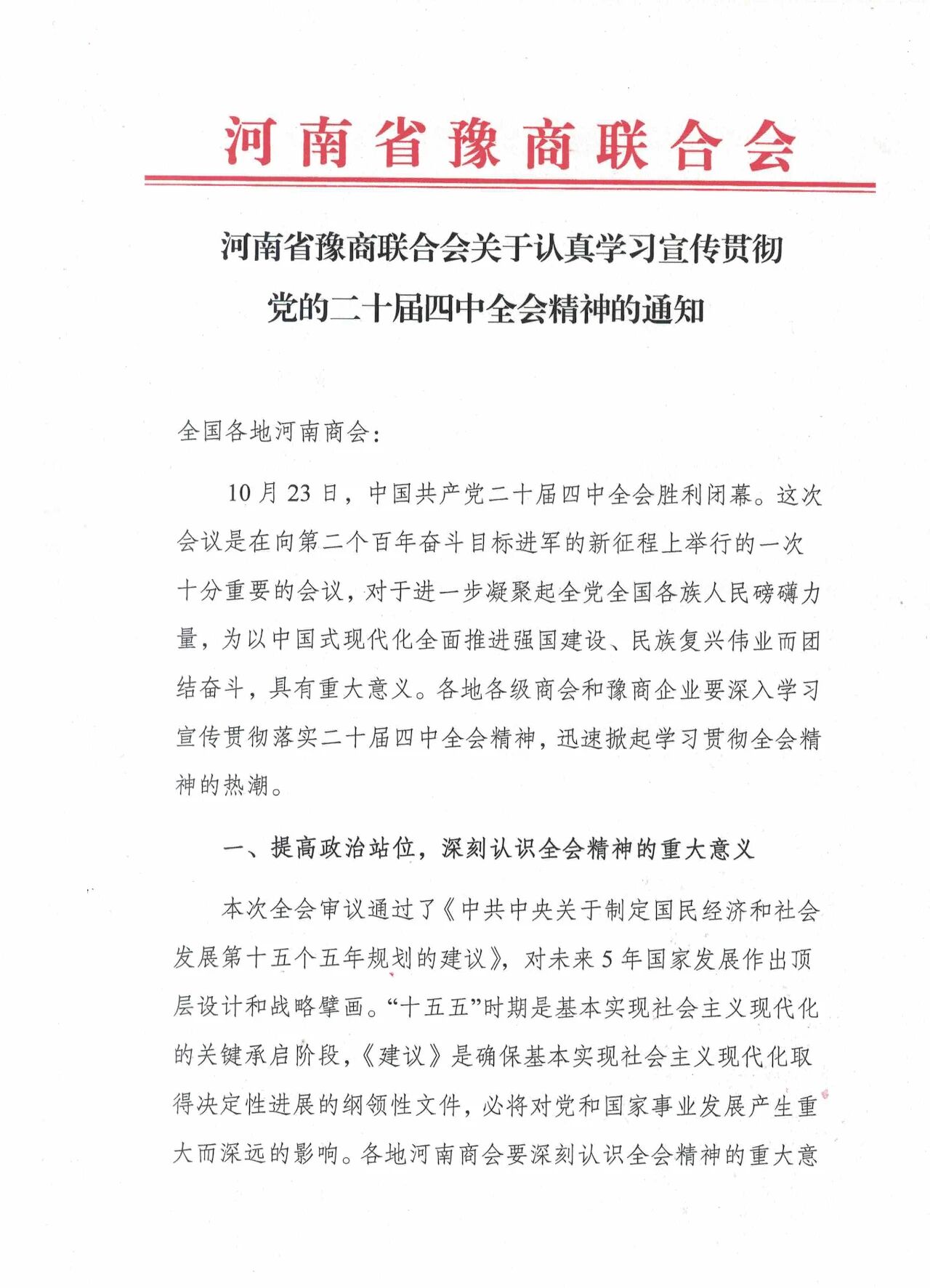 钱国玉指出,党的二十届四中全会是在我国迈上全面建设社会主义现代化国家新征程、向第二个百年奋斗目标进军的关键时刻召开的一次十分重要的大会,对确保基本实现社会主义现代化取得决定性进展具有重大的现实意义和深远历史意义。钱国玉强调,要把学习好贯彻好全会精神作为当前和今后一个时期的重大政治任务,加强思想引领、深入贯彻落实,引导各地河南商会和豫商企业把思想和行动统一到以习近平同志为核心的党中央决策部署上来,坚定信心、拼搏实干,为“十五五”规划目标任务贡献豫商智慧和力量。